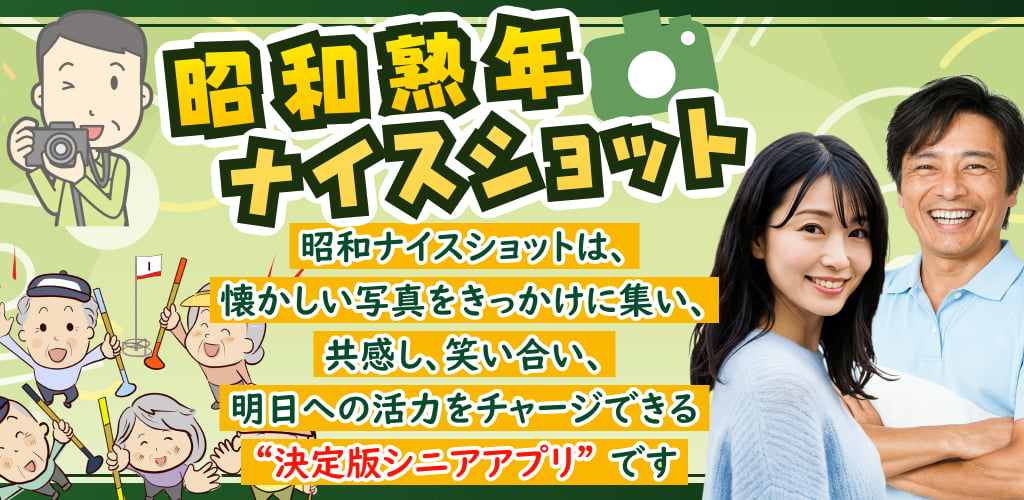 昭和ナイスショット倶楽部 は、そんな “スマホ世代” となった昭和生まれの皆さまが、懐かしい写真〈ナイスショット〉をきっかけに集い、共感し、笑い合い、明日への活力をチャージできる 決定版シニアアプリ です。